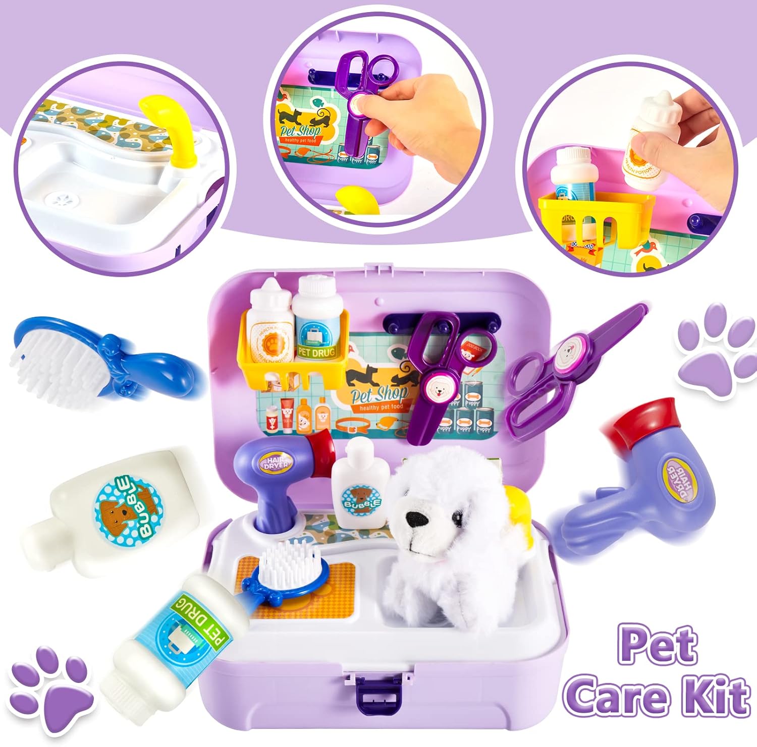 - Package Size: 20×9×24 cm. 16 Pcs Vet Toy Set - With plush puppy, scissors, hair dryer, faucet, food box, shower gel, comb, and so on.