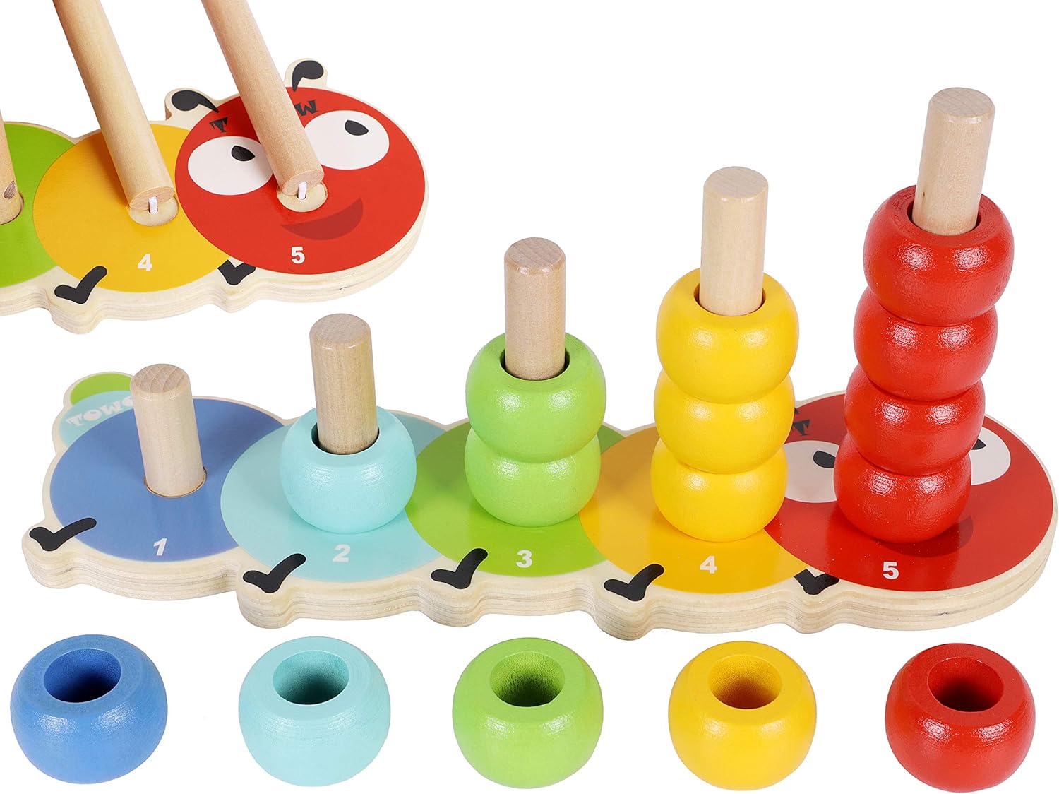 TOWO Wooden Stacking Rings Baby –Lovely Caterpillar Counting Game - Colour Sorting Puzzle - 5 Pegs Ring Stacker - Counting Rings Early Learning Wooden Toys for 1 year old Gift First Birthday Boy Girl