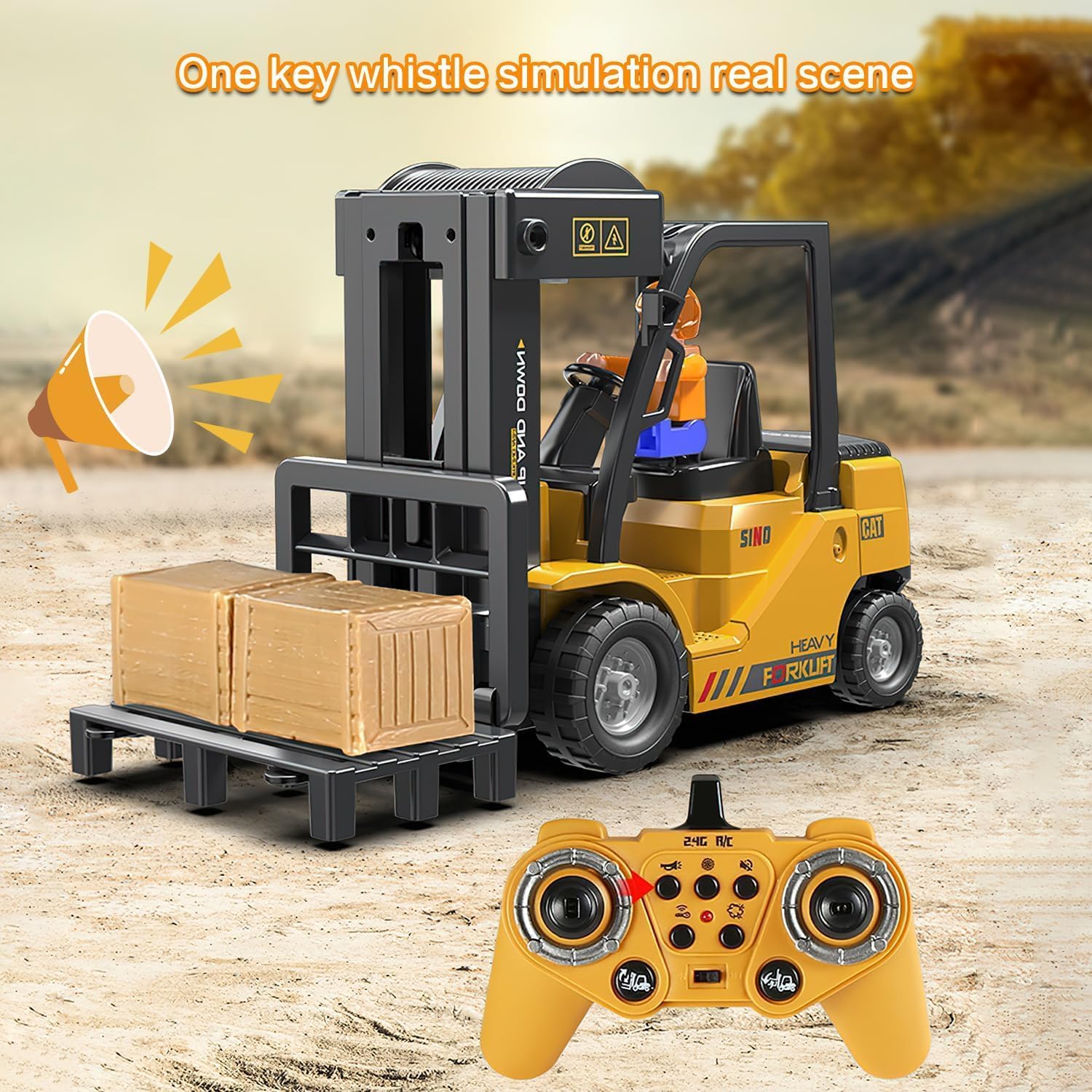 - [11-Channel Forklift:] RC Forklift have eleven different functions, forklift can be forward/backward, left/right, can move the forklift to push the box. The fork on the front of the trolley can be moved up and down. The car also has authentic forklift sounds, illuminated music functions. The car runs and behaves like a realistic forlift car.